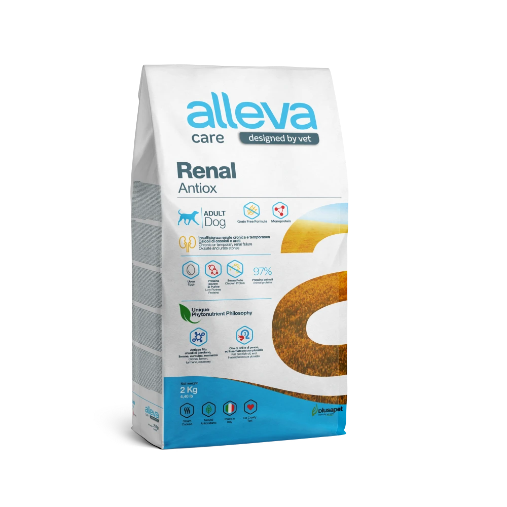 Le Crocchette Per Cani Alleva Care Adult Renal Antiox supportano la funzionalità renale in caso di insufficienza e riducono la formazione dei calcoli da ossalati e urati.