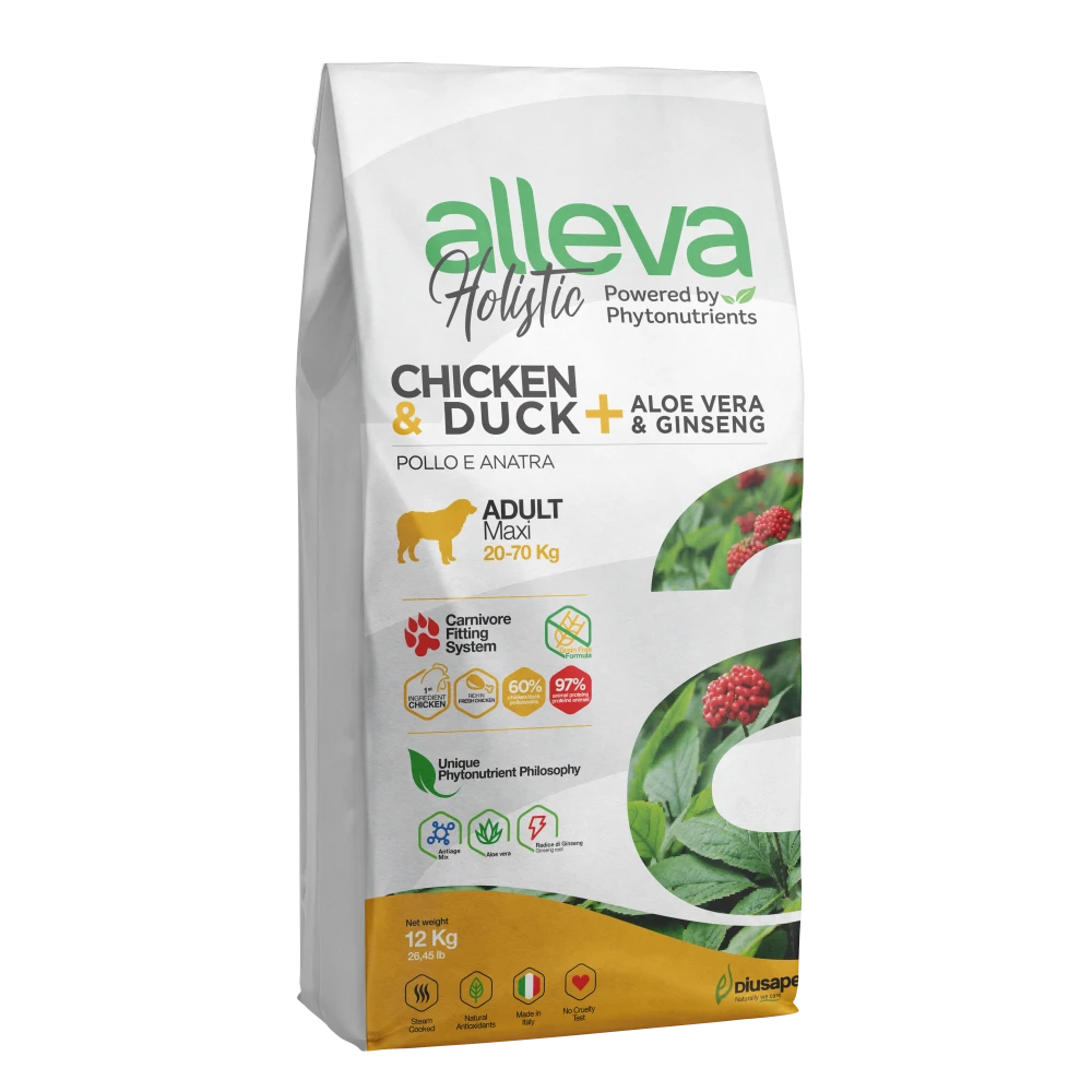 Le crocchette per cani pollo e anatra della linea Holistic, Alleva, sono completamente grain free e ad alto contenuto di proteine da carne disidratata e fresca. In questo modo sono garantite massima appetibilità e carico di aminoacidi essenziali.