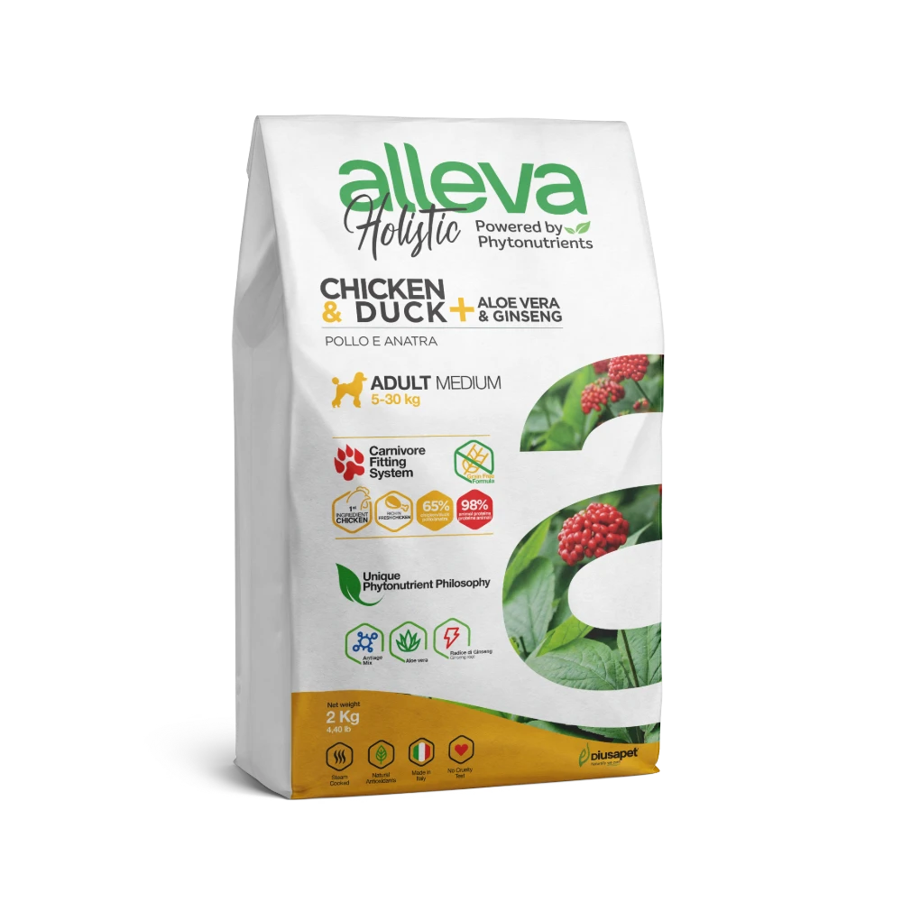 Le crocchette per cani della linea Holistic di Alleva, a base di pollo e anatra, sono completamente grain free e offrono un elevato contenuto di proteine da carne disidratata e fresca. Questo assicura un’ottima appetibilità e un ricco apporto di aminoacidi essenziali per il benessere del tuo cane.