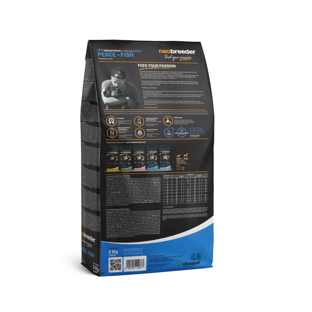 Le crocchette Neobreeder per cani adulti di taglia media e grande al gusto pesce sono perfette per cani che necessitano di un’alimentazione ricca di proteine e acidi grassi essenziali. Queste crocchette supportano la salute articolare, grazie alla presenza di glucosamina e condroitina, che contribuiscono a mantenere le articolazioni forti e mobili anche nei cani di taglia più grande. Inoltre, la formula bilanciata aiuta a mantenere un peso corporeo ideale e un sistema digestivo sano, favorendo una digestione ottimale e il benessere intestinale.