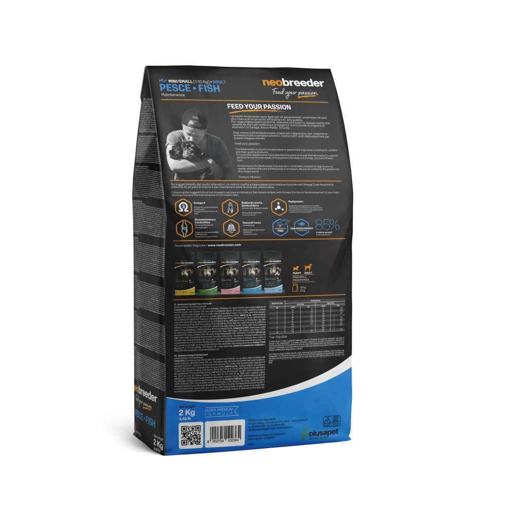 Le crocchette Neobreeder al gusto pesce sono pensate per offrire un apporto nutrizionale completo che supporta la salute del tuo cane adulto di piccola taglia. Con proteine di alta qualità e omega-3, favoriscono la salute della pelle e del pelo, mentre glucosamina e condroitina contribuiscono a mantenere le articolazioni agili e forti.