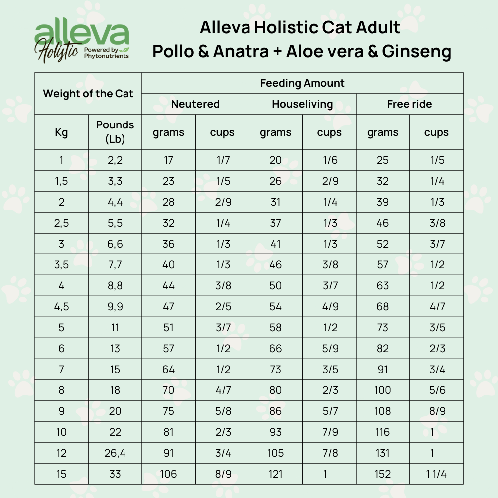 Con un mix di proteine animali di alta qualità, aloe vera e ginseng, Alleva Holistic Adult Chicken & Duck è l’alimento ideale per sostenere la vitalità, la salute digestiva e il sistema immunitario del tuo gatto. Se desideri offrirgli un pasto gustoso, sano e completo, queste crocchette sono la risposta perfetta.
